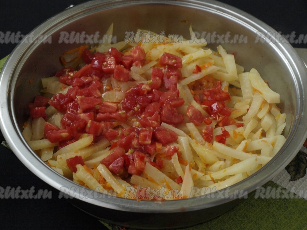 Очистить от шкурки помидор, нарезать кубиками и добавить его в сковороду, блюдо посолить и протушить кольраби ещё 10 минут под крышкой, периодически перемешивая.