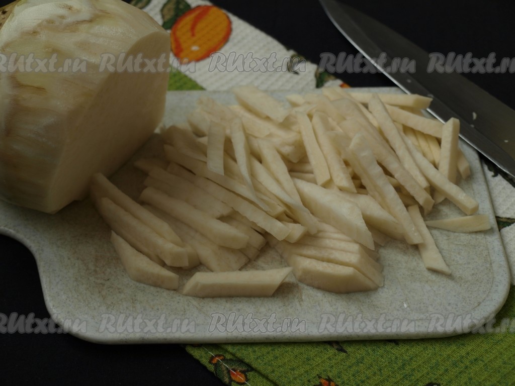 Кольраби очистить при помощи овощечистки и нарезать брусочками. Кольраби по структуре и плотности имеет схожесть с корнем сельдерея, по крайней мере мне так кажется.