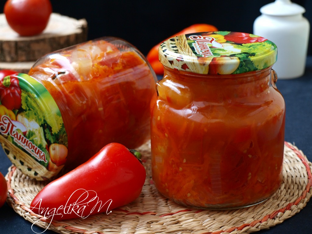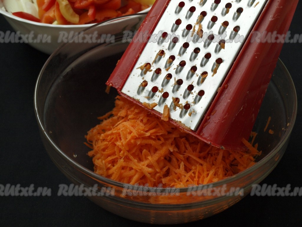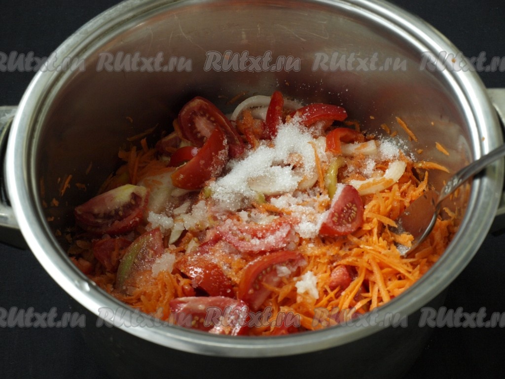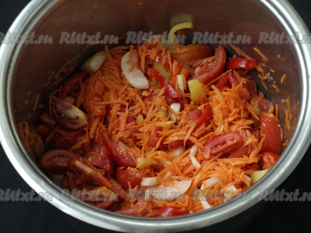 Помидоры, лук, болгарский перец и морковь переложить в кастрюлю, в которой салат будет впоследствии вариться.
