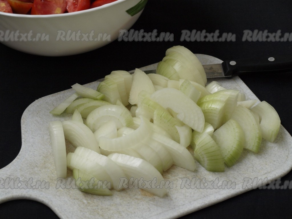 Нарезать полукольцами или четверть кольцами очищенный лук.