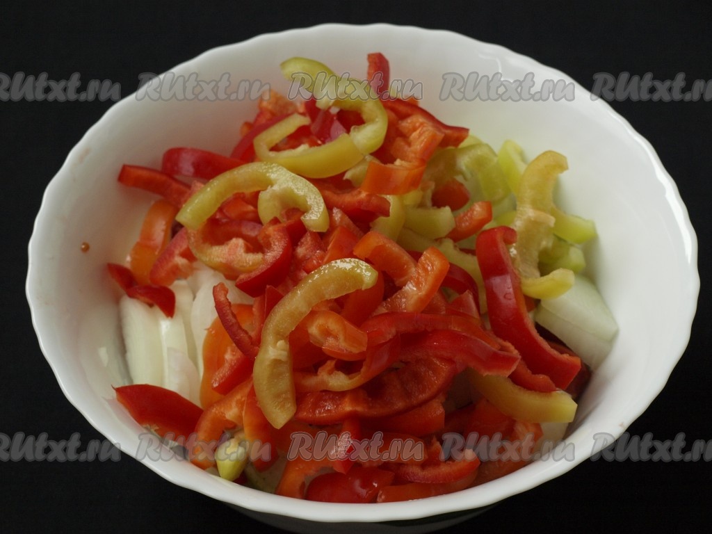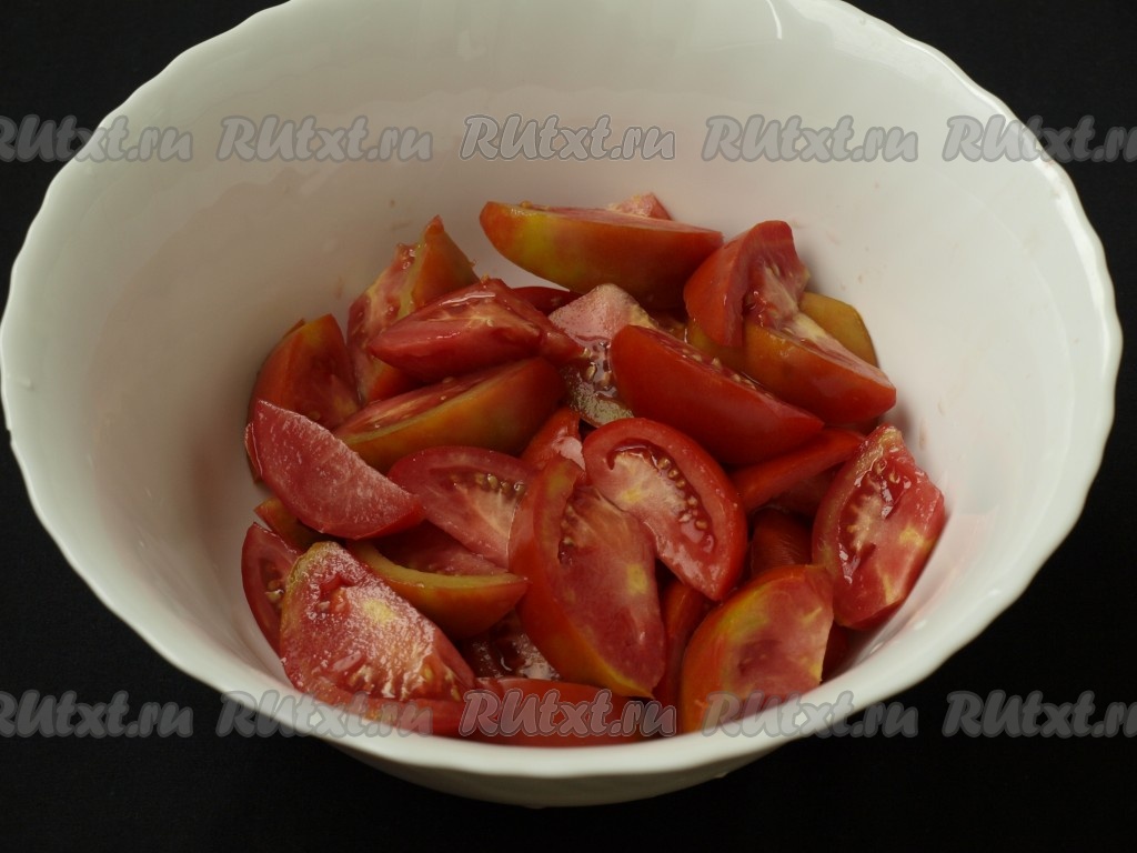 Добавить лук к помидорам. Болгарский перец очистить от семян и нарезать полукольцами.