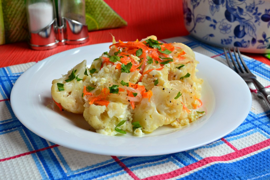 Сочную, очень вкусную цветную капусту, приготовленную с яйцом в духовке, подать к столу в теплом виде.