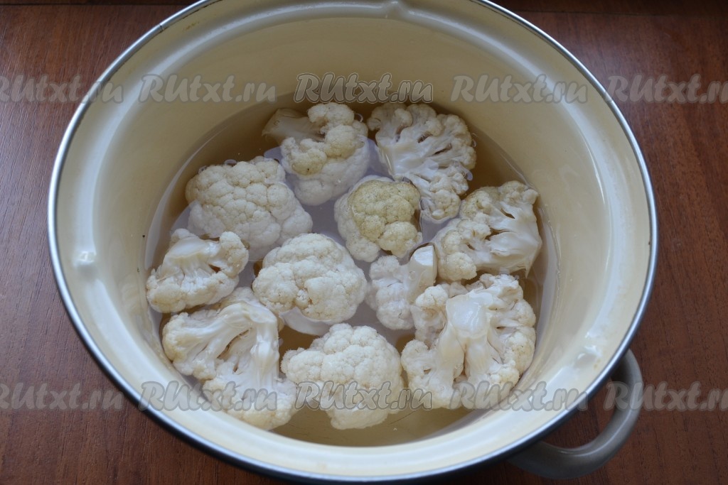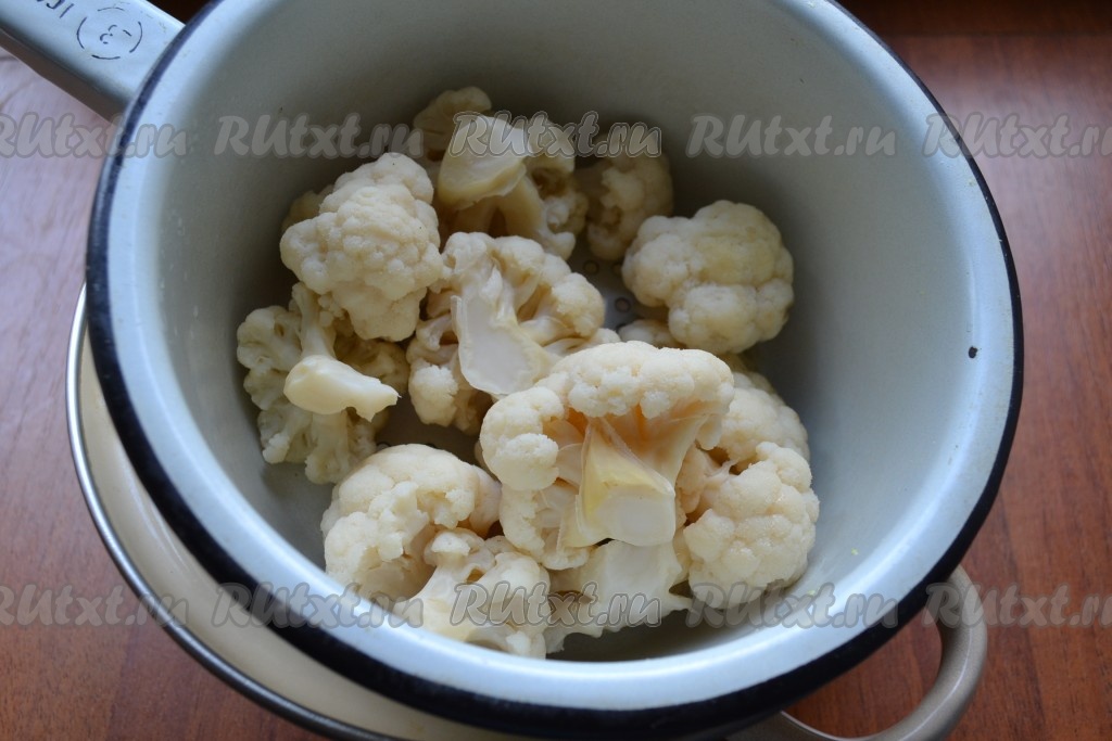 Цветную капусту разобрать на соцветия, выложить в кастрюлю, залить водой, поставить на огонь и, уменьшив огонь после закипания, варить 6-7 минут.