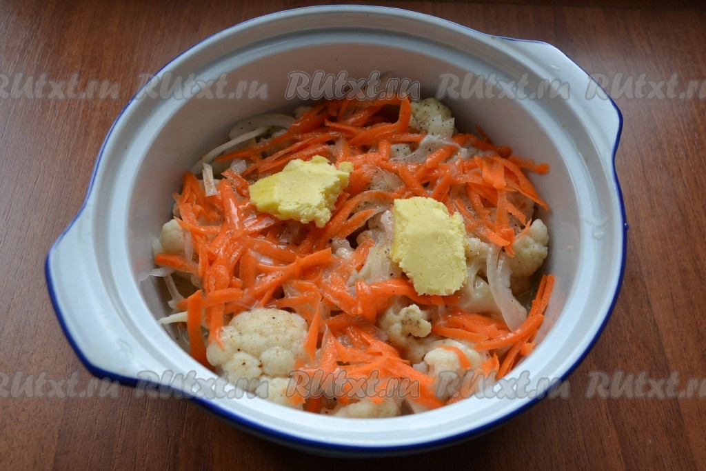 Залить капусту и овощи взбитыми яйцами, сверху разместить пару кусочков сливочного масла. Форму можно не накрывать.