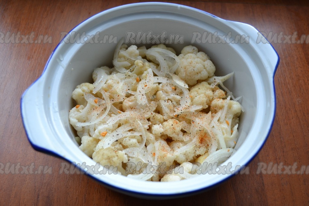 Далее выложить капусту в небольшую форму для запекания, сверху разложить нарезанный тонкими полукольцами и ошпаренный кипятком очищенный репчатый лук, посыпать специями.