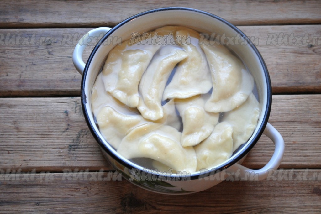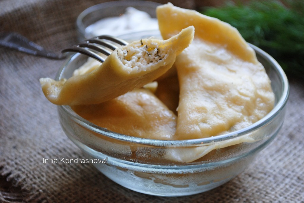 Очень вкусные вареники с солёным творогом готовы, подаём их горячими со сметаной.