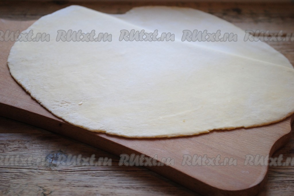 На столе, припыленном мукой, раскатать тесто в пласт толщиной 1-2 мм.