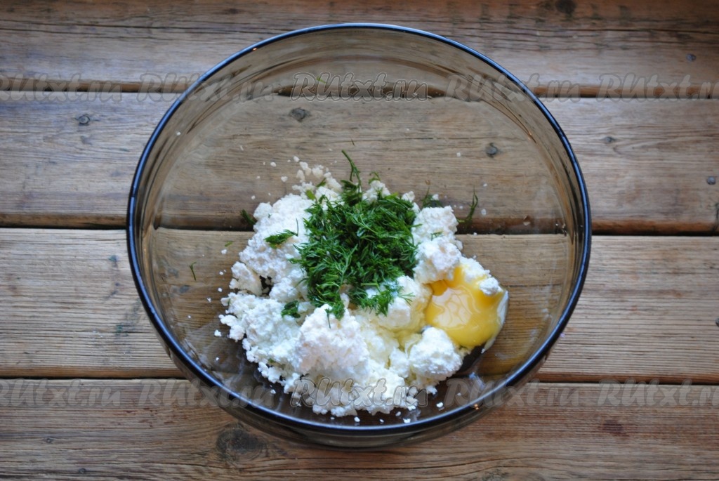 Для приготовления начинки соединить творог, соль, мелко нарезанный укроп и сырое яйцо, хорошо перемешать. Начинка для вареников готова.