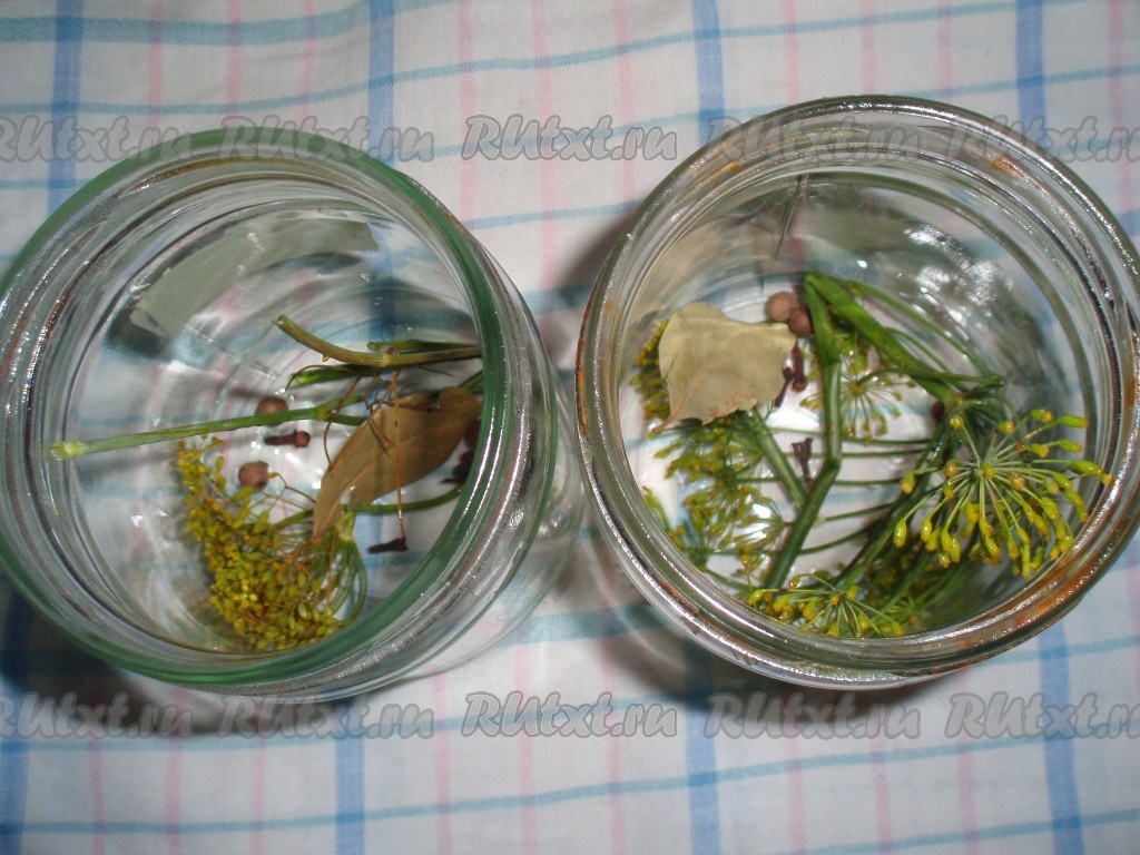 Банки вымыть, простерилизовать. В каждую баночку положить по веточке укропа, 1 лавровый лист, 5 горошин душистого перца и 3 бутона гвоздики.
