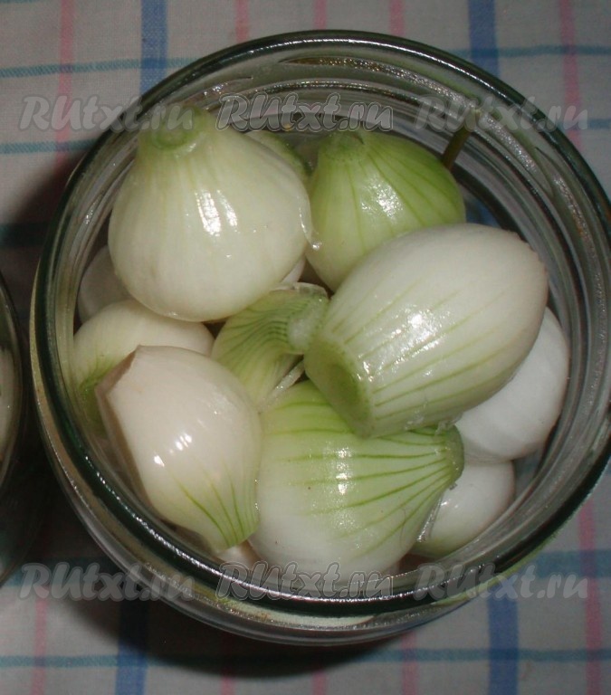 Плотно уложить луковки в банки.