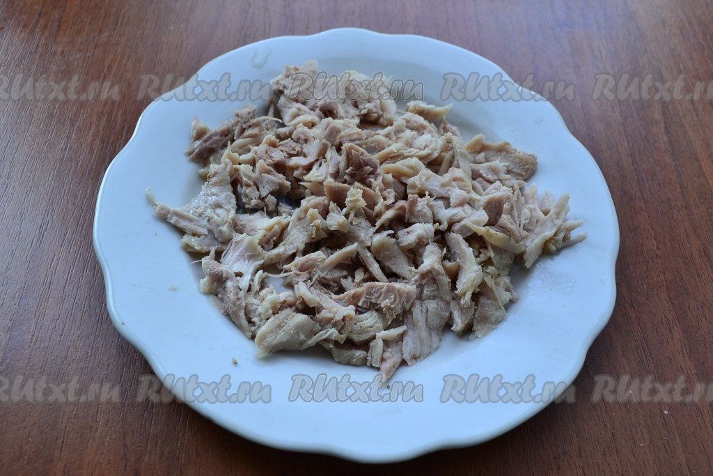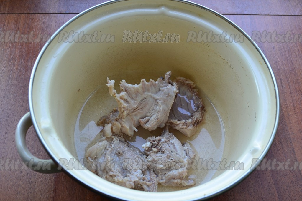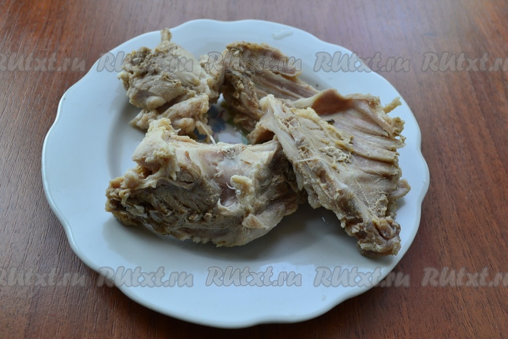 Мясо, отделив от костей, нарезать маленькими кусочками.