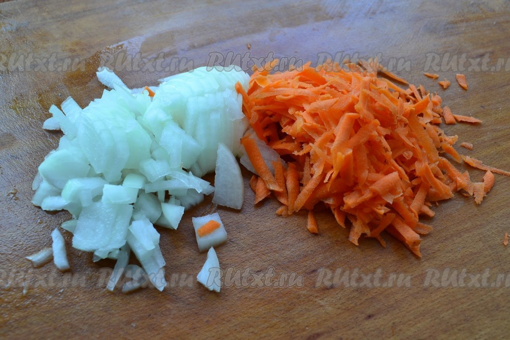 Лук мелко нарезать, морковь натереть на крупной терке.
