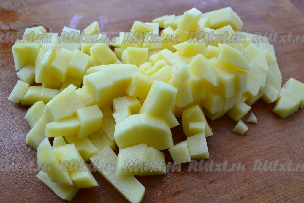 Очистить лук, картошку и морковь. Картофель нарезать небольшими кубиками.