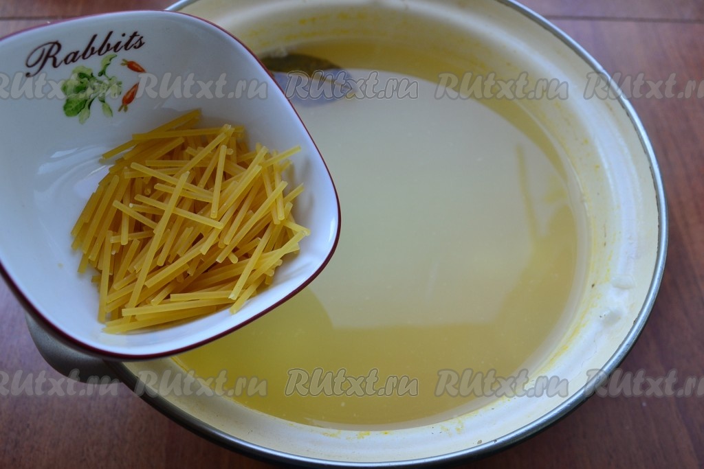 Далее, по желанию, всыпать вермишель, суп из кролика посолить по вкусу и варить еще 10-15 минут.