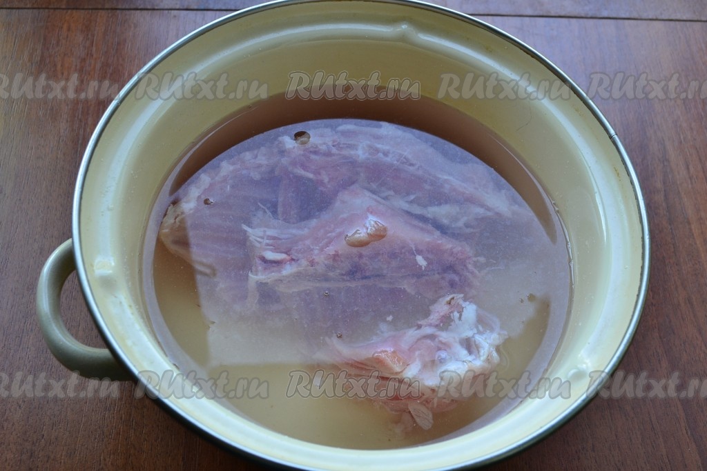 Затем эту воду слить в раковину, мясо промыть и снова поместить в кастрюлю.