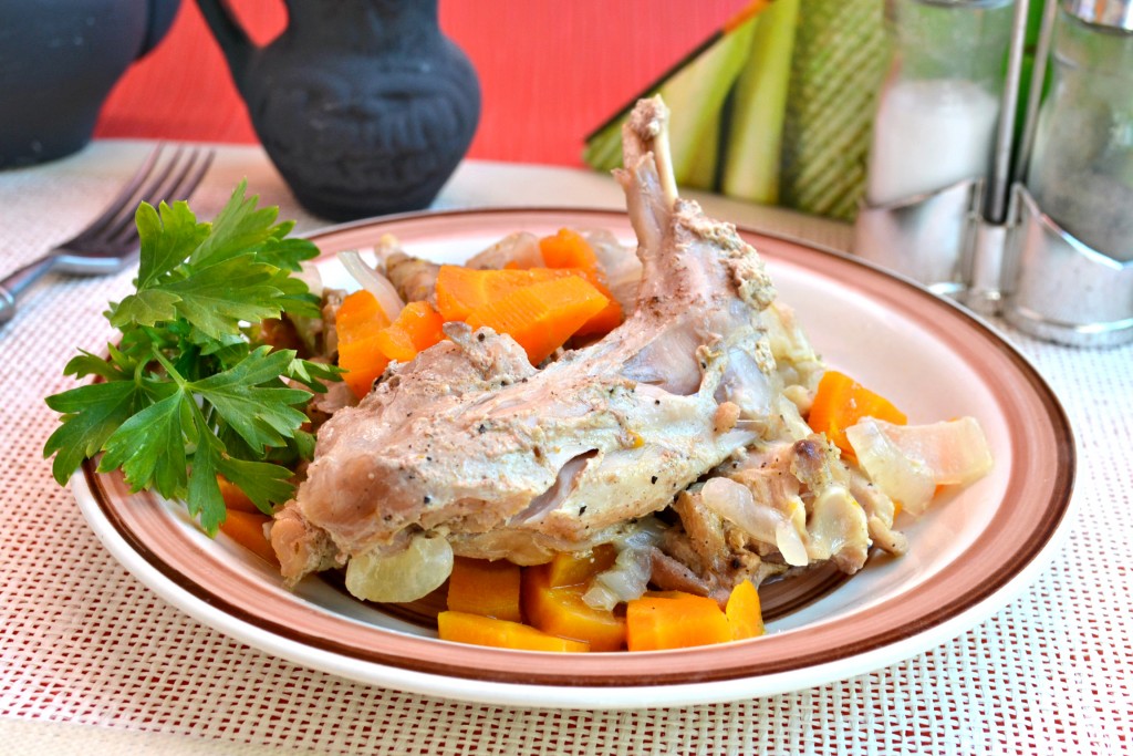 Теперь можно достать из духовки необычайно вкусного и нежного кролика, приготовленного в банке, и подать к столу. Морковь и лук также получаются очень вкусными!