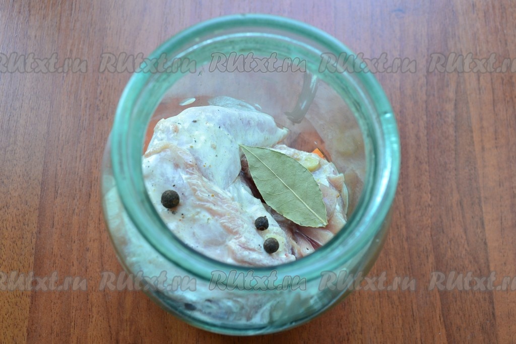 Поместить банку с кроликом на решетку холодной духовки, закрыть дверцу и включить духовку на 170 градусов. Далее подойти к духовке через 2 часа и выключить ее. Дверцу не открывать в течение 20 минут, после чего достать банку из духовки.