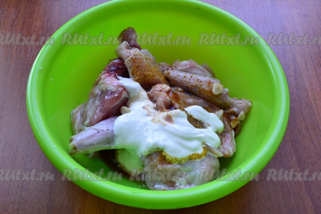 Кролика разделить на части, посыпать специями, добавить нарезанный чеснок.