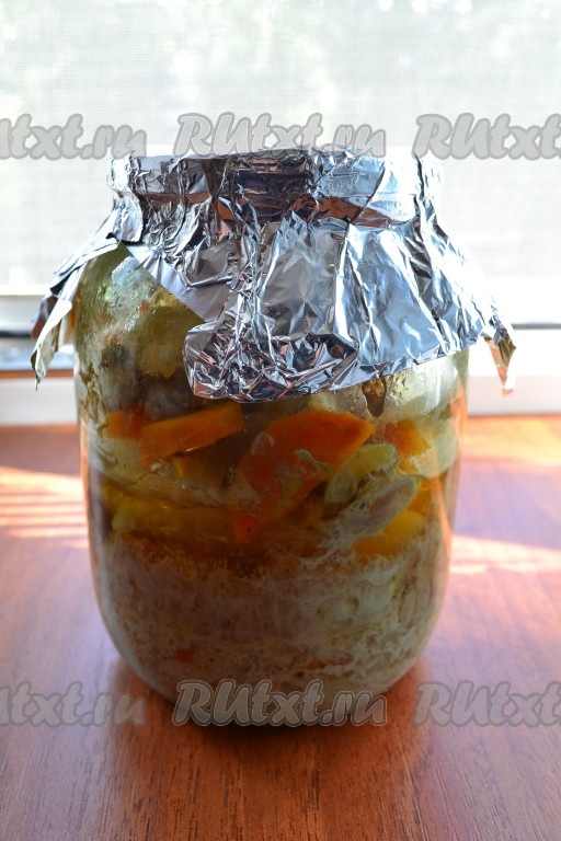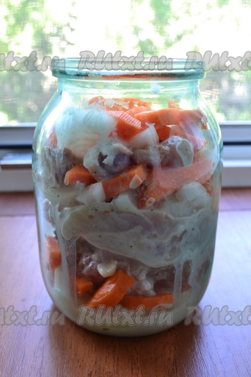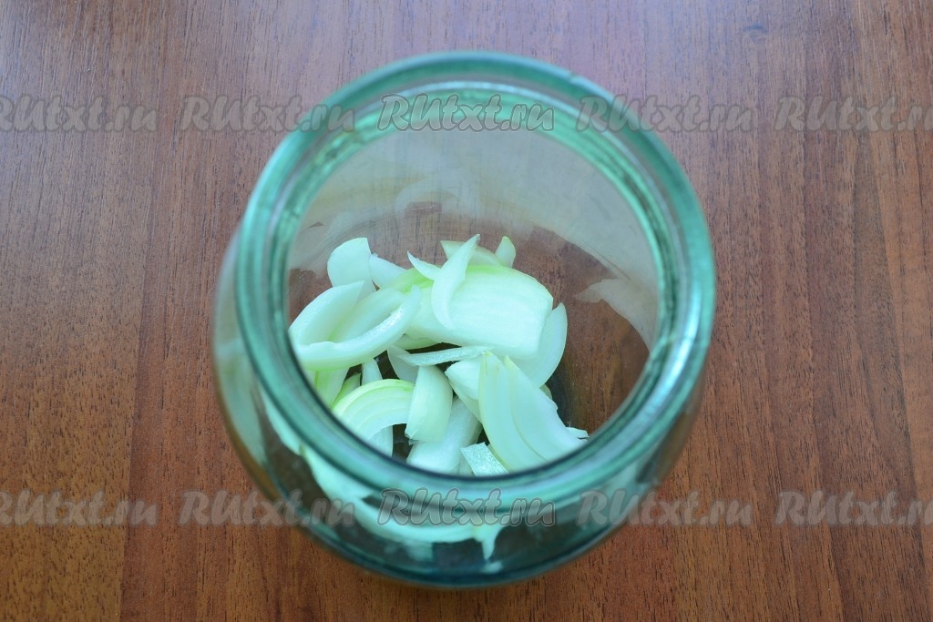 Хорошо все перемешать. На дно чистой и сухой банки поместить часть крупно нарезанного очищенного лука.