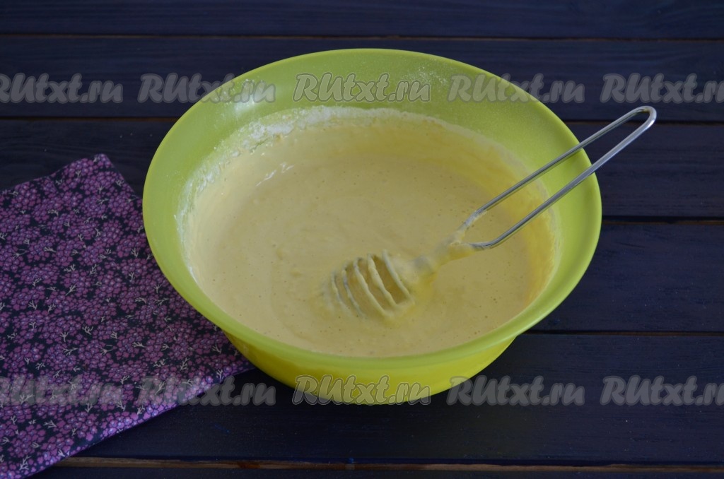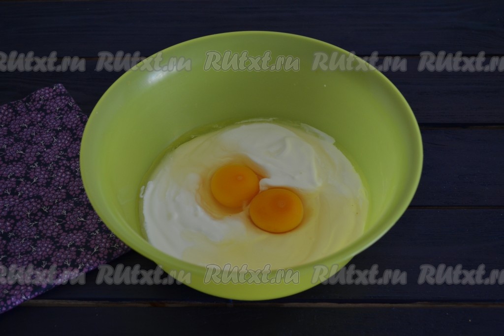 В глубокой миске соединить сметану и куриные яйца.