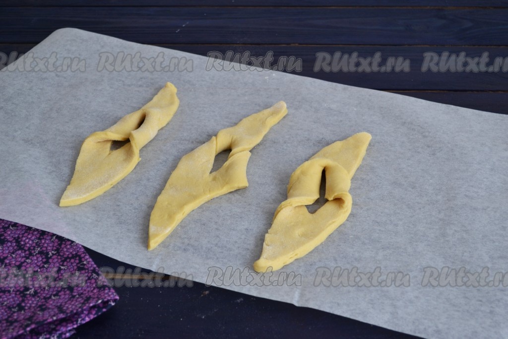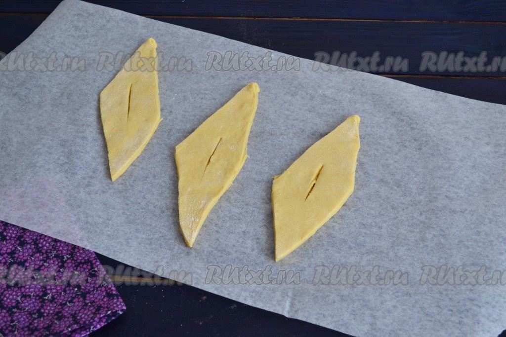 Тесто нарезать на ромбы. Величина их будет зависеть только от Ваших предпочтений, на вкус это не повлияет. В середине каждого ромба прорезать дырочку.