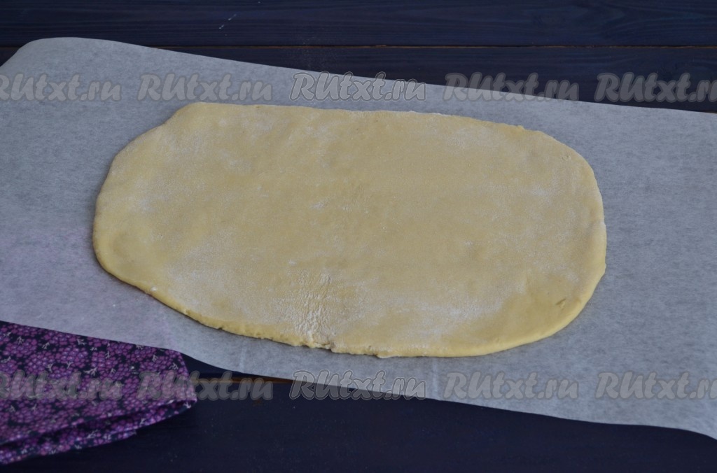 Для того чтобы с тестом было удобно работать, разрезать его на 2-3 части. Одну из частей теста раскатать в пласт толщиной 1 см. Две другие части накрыть салфеткой, чтобы тесто не подсыхало.