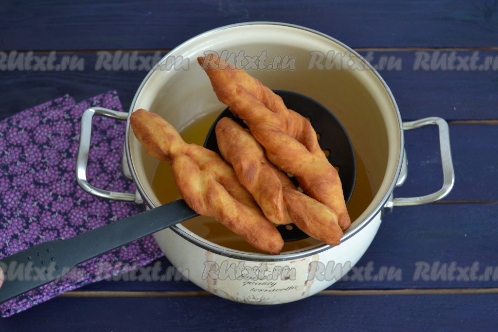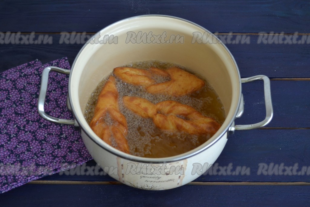 Во фритюрнице или в обычной кастрюле хорошо прогреть растительное масло и выложить часть заготовок. Лучше обжаривать небольшими порциями, так как во время обжаривания вергуны значительно увеличатся в объемах.