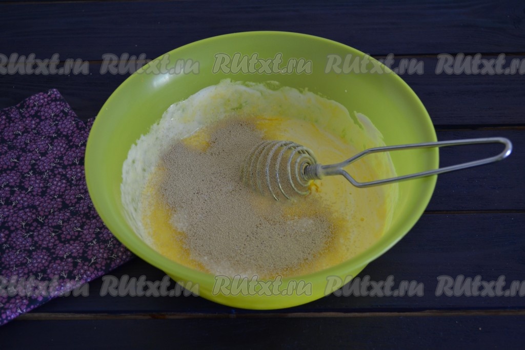 Яйца со сметаной немного разболтать венчиком, всыпать сахар и сухие быстродействующие дрожжи. Можно использовать и мокрые дрожжи, но тогда нужно будет добавить к дрожжам 2-3 столовые ложки муки, перемешать и оставить на 30 минут в теплом месте, чтобы дрожжи активировались, и только потом замесить тесто.