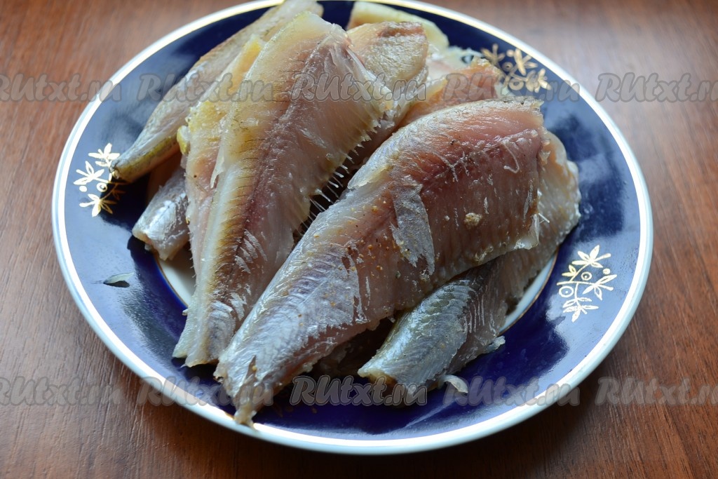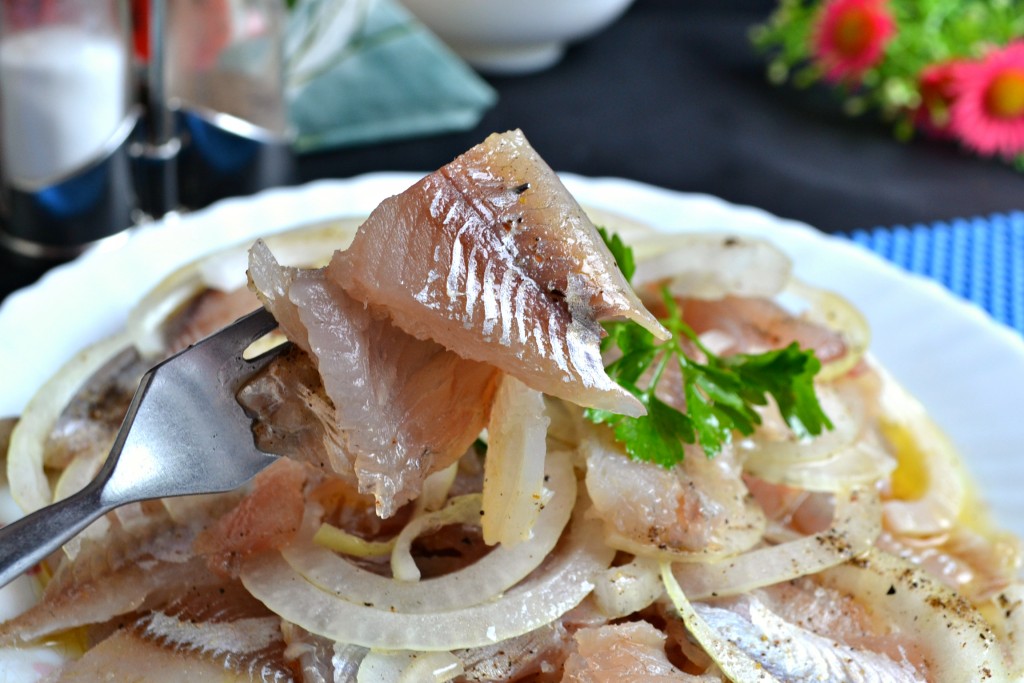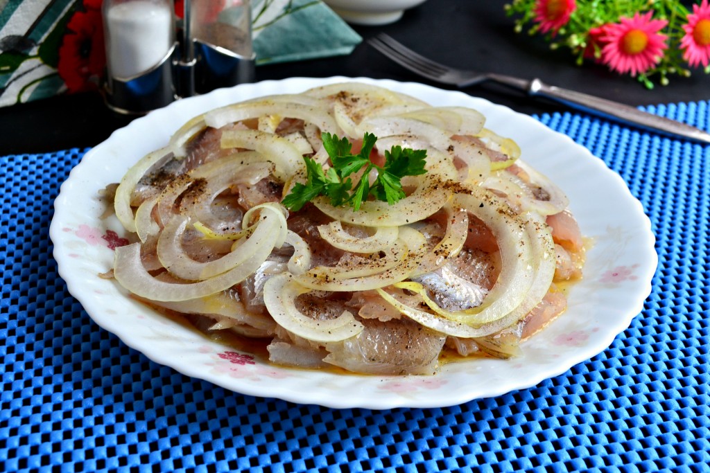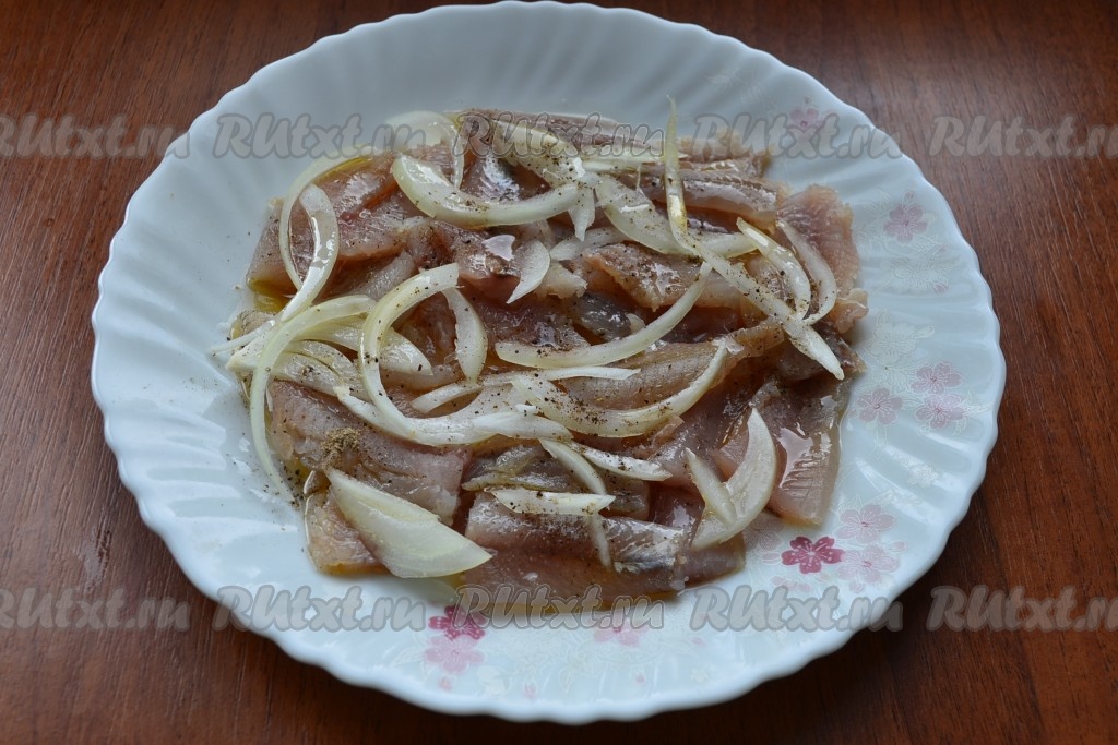 Теперь самое кропотливое - нужно отделить рыбку от всех костей, выкладывая кусочки на тарелку. Рыбу поперчить, сбрызнуть уксусом, полить подсолнечным маслом и посыпать полукольцами репчатого лука. Можно выкладывать рыбу в несколько слоев.
