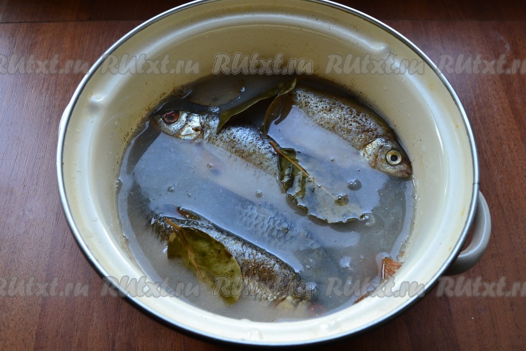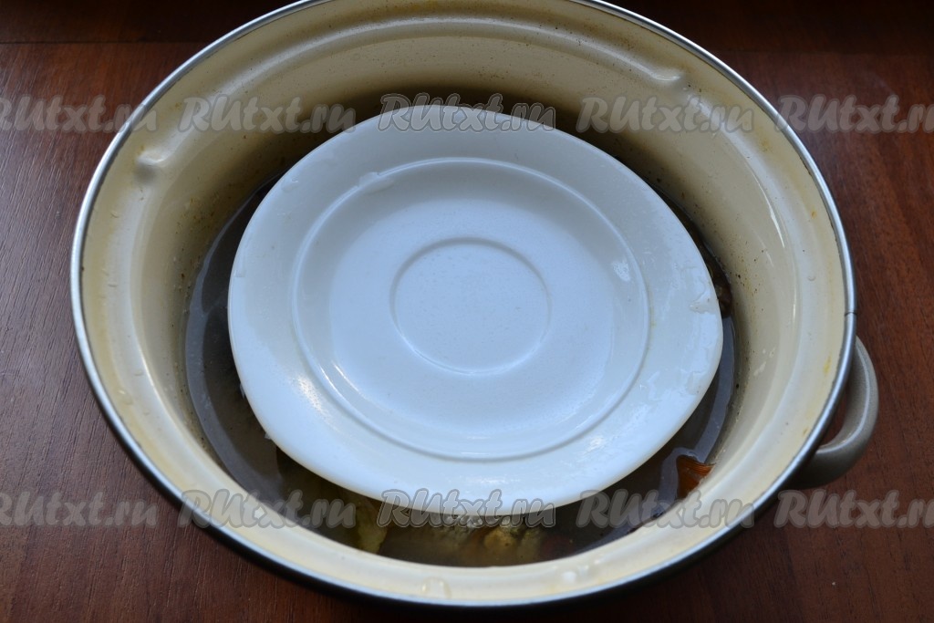 Сверху накрыть лещей в маринаде тарелкой, поверх которой поставить гнет. Оставить рыбу на сутки при комнатной температуре.