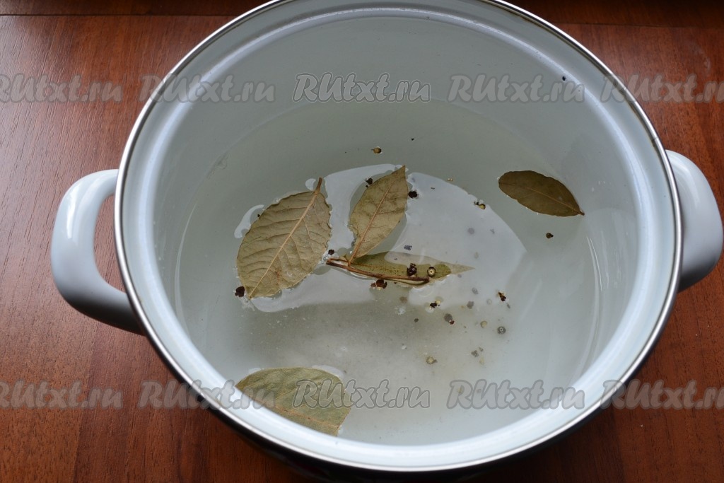 Для приготовления маринада налить воду в кастрюлю, добавить соль, лавровые листья и черный перец горошком. Поставить кастрюлю на огонь, довести маринад до кипения. Влить уксус, перемешать и снять кастрюлю с огня. Маринад полностью остудить.