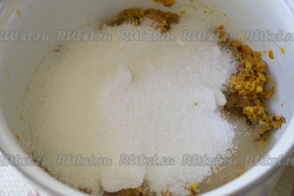 К прокрученным ягодам облепихи добавить сахар.