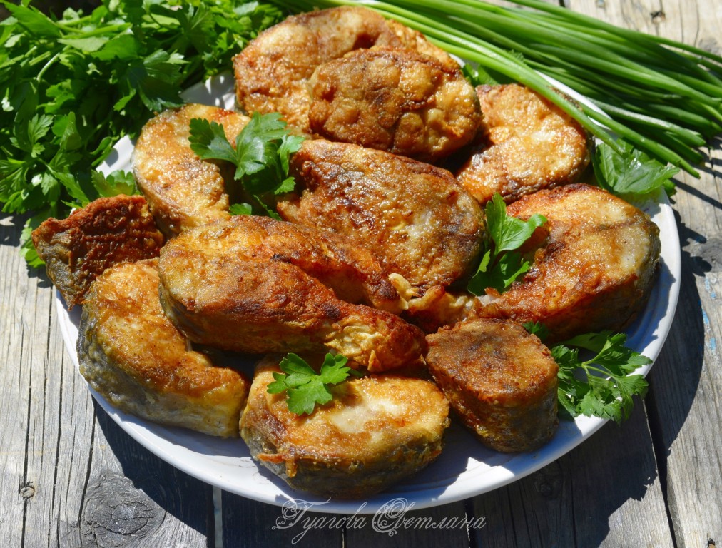 Выкладываем кусочки жареного белого амура на блюдо и подаем с картофелем или с любым гарниром на Ваш вкус! Мы такую рыбу любим как в горячем, так и в холодном виде. Рецепт приготовления белого амура очень прост, а сочная рыбка с хрустящей корочкой понравится многим.