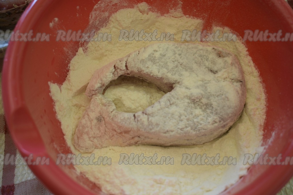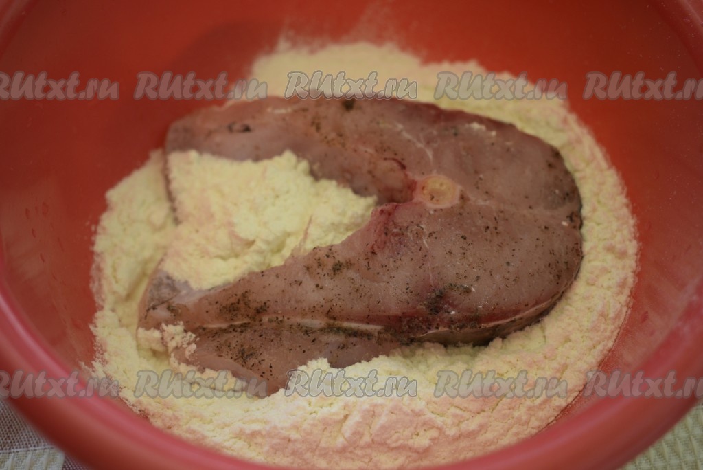 Каждый кусочек рыбы обваливаем в муке с двух сторон.