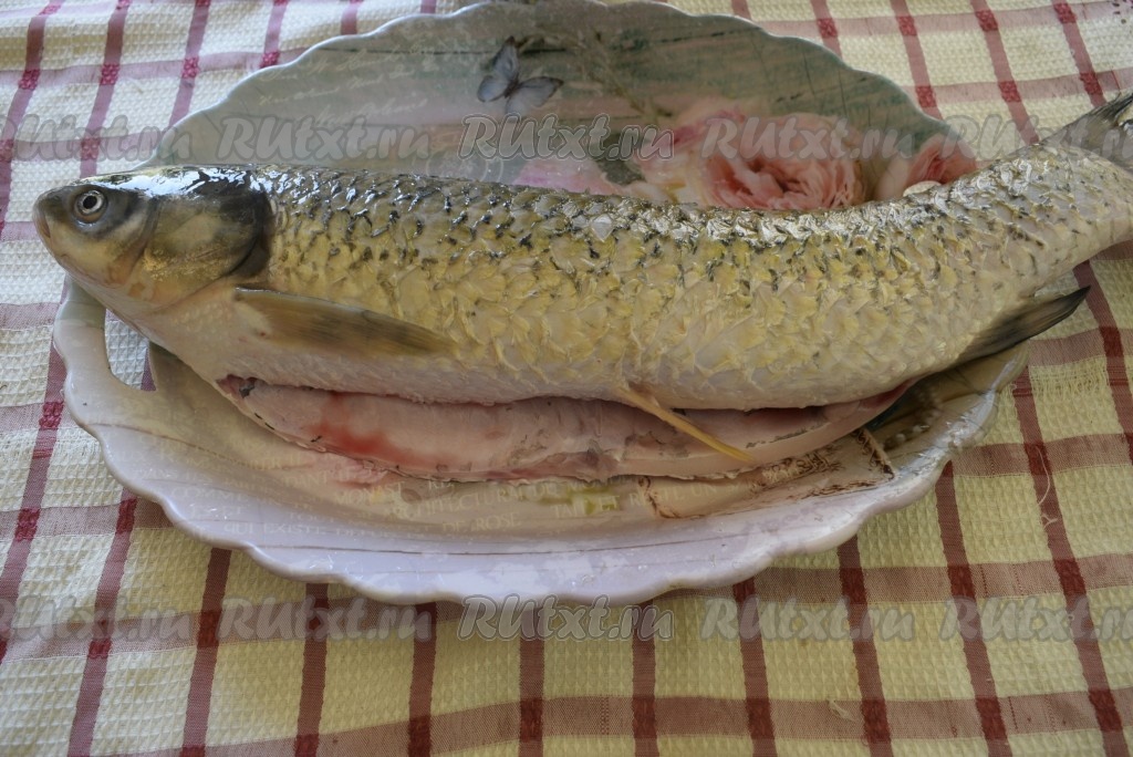 Отрезаем голову и хорошо промываем рыбу. Режем белого амура на порционные кусочки шириной 2 см (или как вы любите).