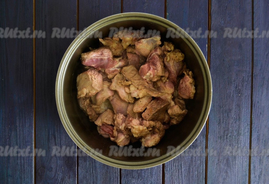 Тщательно вымыть мясо и нарезать средними кусочками, примерно, с размер грецкого ореха.