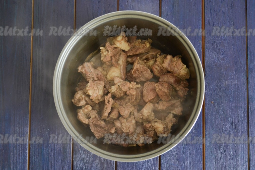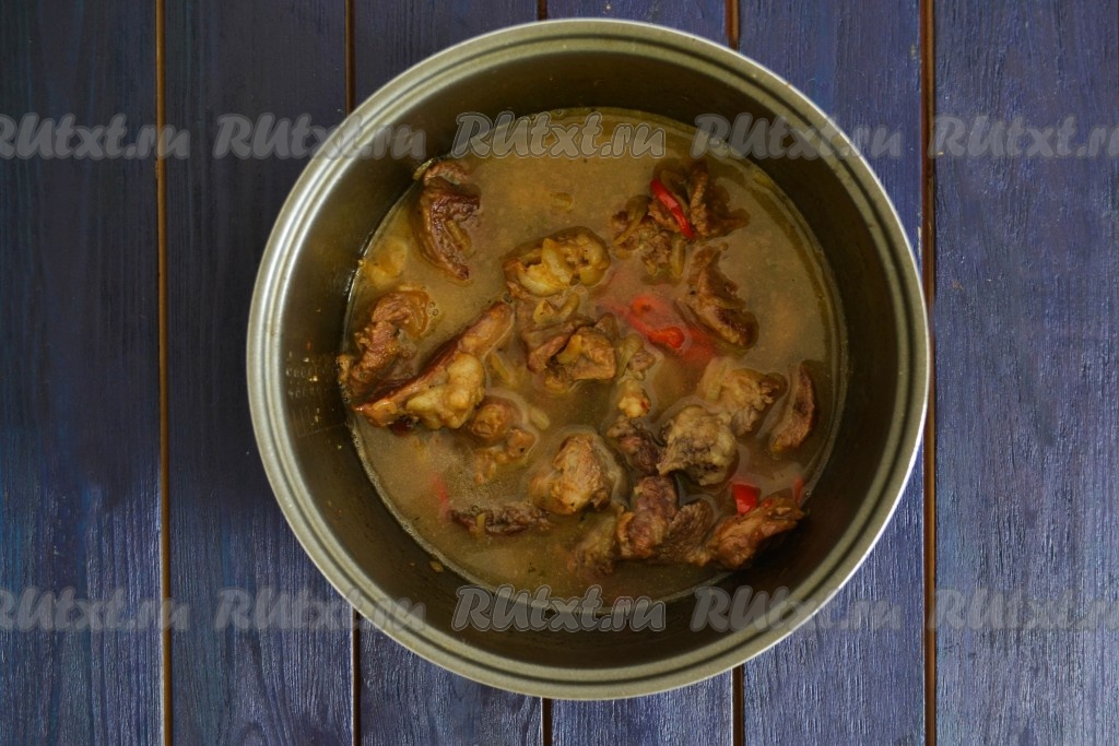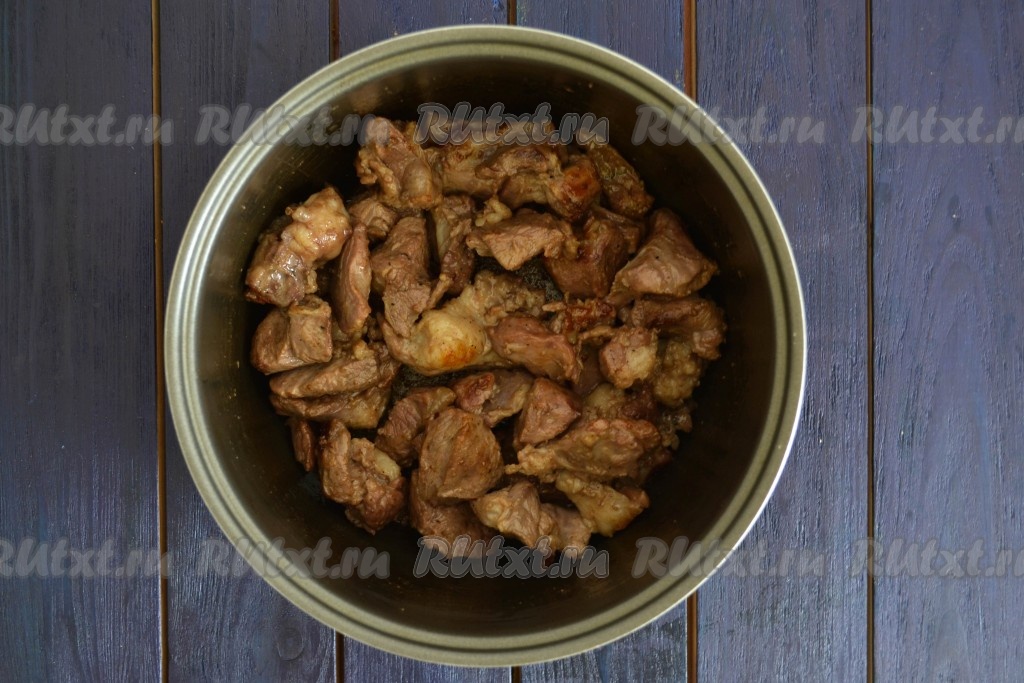 Сразу мясо пустит много сока, сливать его не нужно. Периодически помешивая, дождаться полного испарения жидкости. Крышку мультиварки при этом не закрывать.