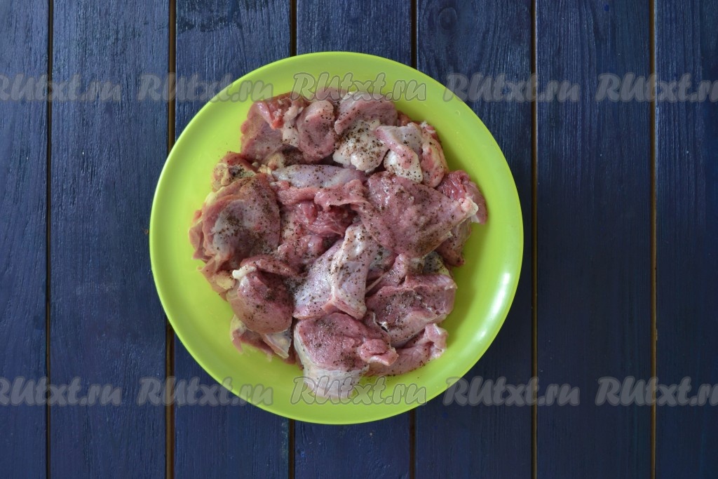 Кусочки козлятины посолить, приправить черным молотым перцем, тщательно перемешать и оставить на 15 минут.