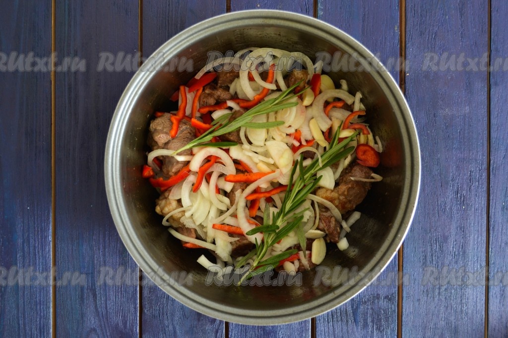 Очистить репчатый лук и нарезать тонкими полукольцами. Перец, очистив от семян и плодоножки, нарезать соломкой. Очищенные зубчики чеснока нарезать пластинами. Лук, чеснок и сладкий перец выложить к мясу. По желанию, добавить 1-2 веточки розмарина. Перемешивая все содержимое, обжарить еще 2-3 минуты.