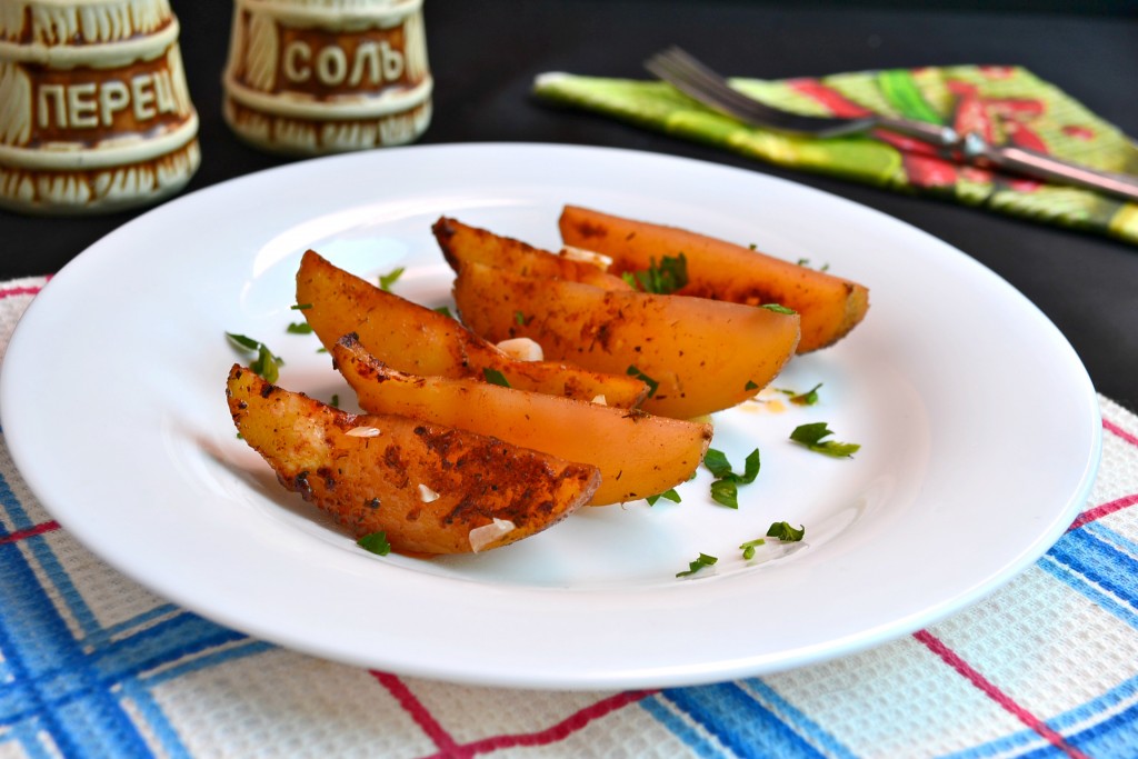 Ароматный и очень вкусный картофель по-деревенски, приготовленный в микроволновке, подаём в горячем виде к столу, посыпав зеленью.