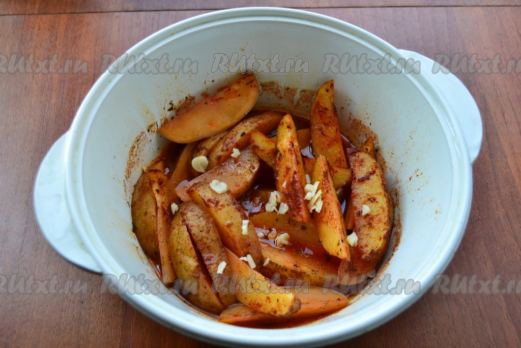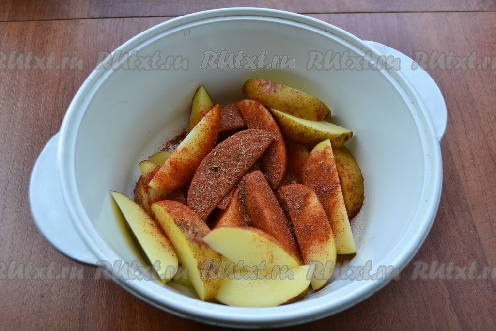 Каждую не очищенную картофелину разрезать на 8 долек, поместить в кастрюлю, предназначенную для приготовления в микроволновке. Всыпать приправу для картофеля (в нее входит и соль).