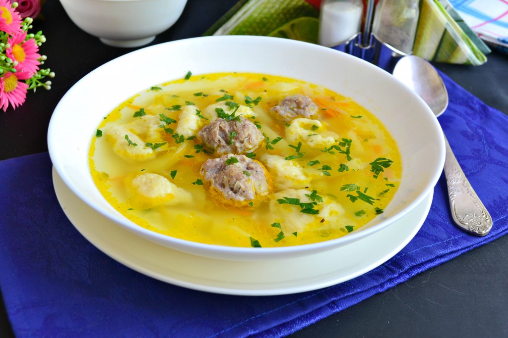 Суп с фрикадельками и клецками - это необычайно вкусное и сытное первое блюдо для вашего повседневного обеденного стола. Обязательно попробуйте приготовить такой супчик! Фарш для фрикаделек я использовала свиной, можно - свино-говяжий, говяжий или куриный.