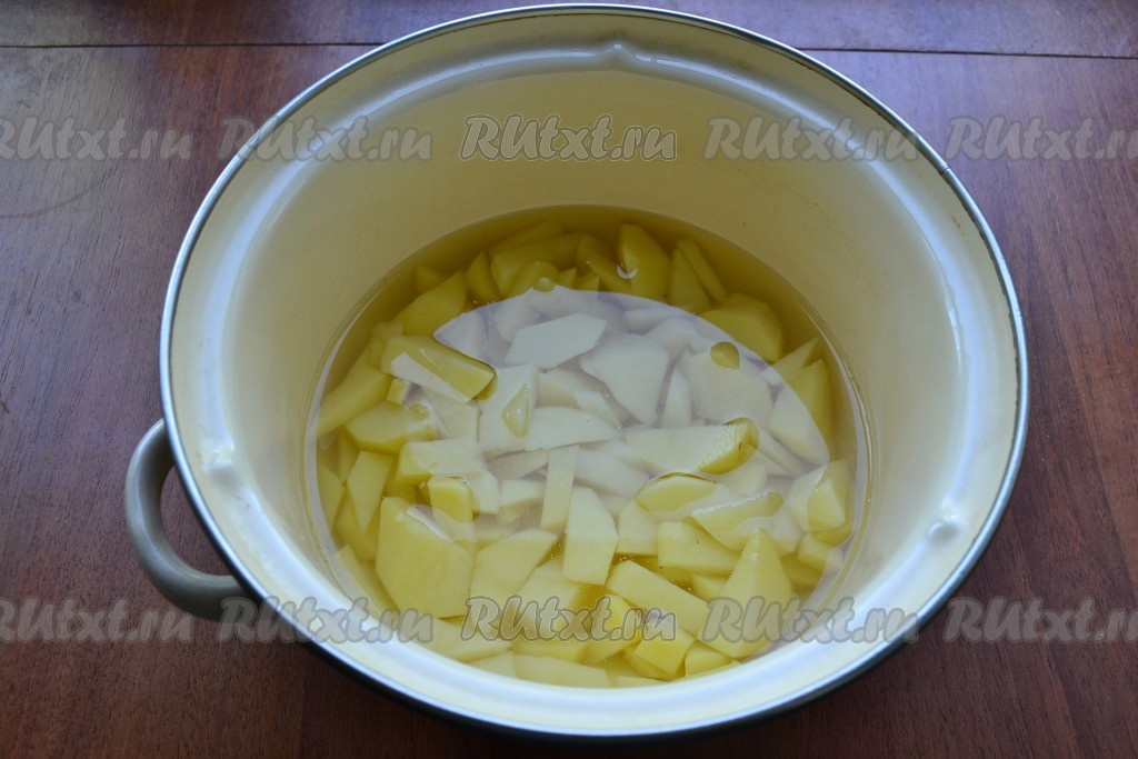 Картофель, очищенный и нарезанный небольшими кусочками, выложить в кастрюлю, влить воду. Поместить кастрюлю на огонь, довести до кипения, затем варить картошку до готовности (25-30 минут) на небольшом огне, подсолив воду.