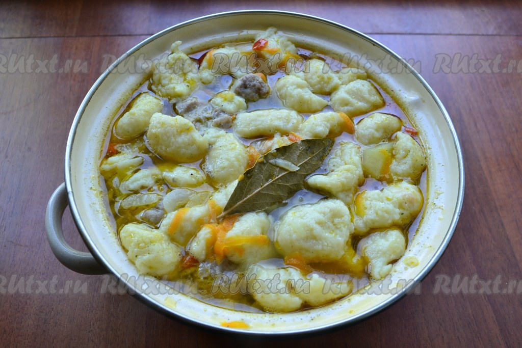 Далее суп аккуратно перемешать, добавить лавровый лист и измельченный чеснок, варить суп на слабом огне до всплытия клецок (4-5 минут).