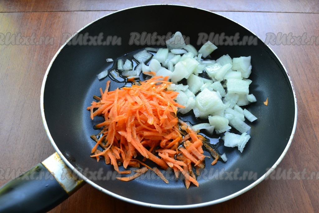 Оставшийся лук очистить и нарезать достаточно мелко, очищенную морковь натереть на крупной терке, поместить овощи в сковороду, влить растительное масло.