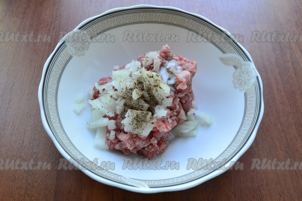 К фаршу добавить половину очищенного мелко нарезанного репчатого лука, посолить и поперчить.