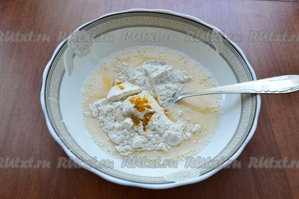 Хорошенько все расколотить вилкой, всыпать муку и добавить щепотку куркумы или порошка карри, тщательно перемешать.