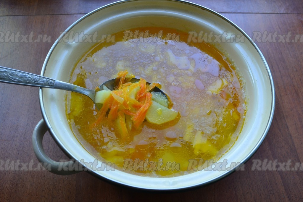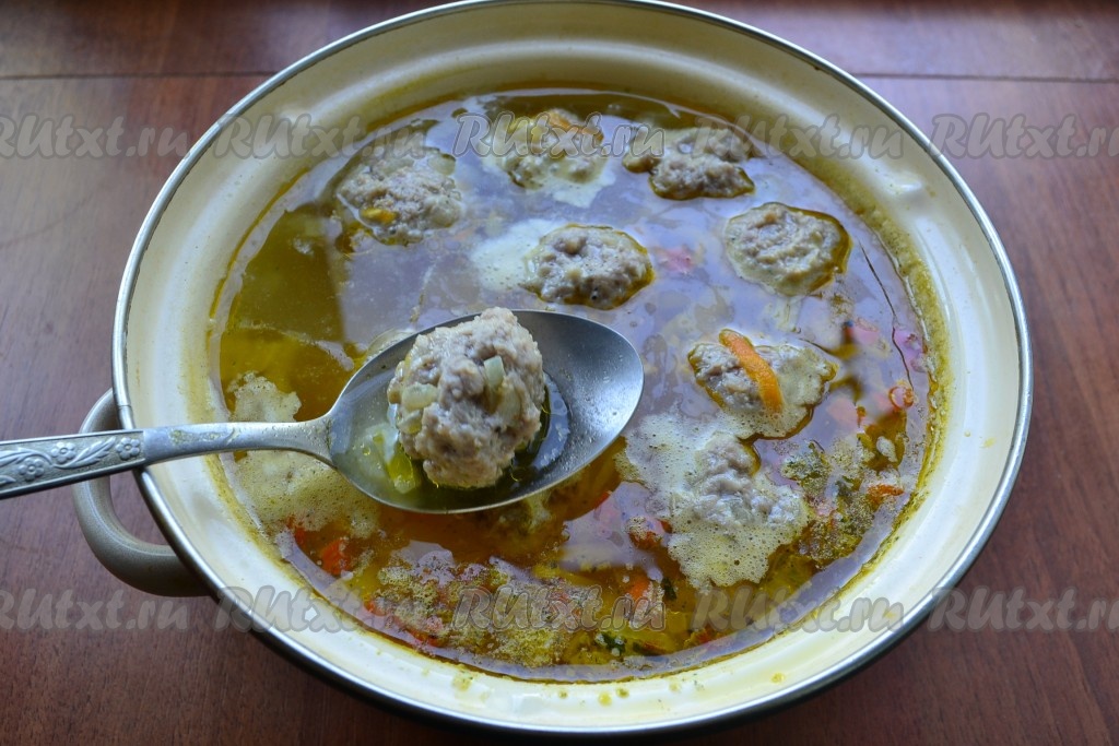Затем выложить в кастрюлю фрикадельки и варить суп с момента закипания 10 минут на небольшом огне.