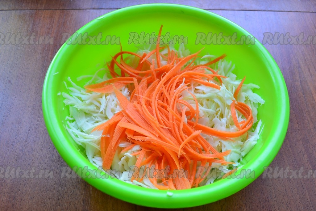 Капусту тонко нашинковать, добавить очищенную морковь, натертую на корейской терке.
