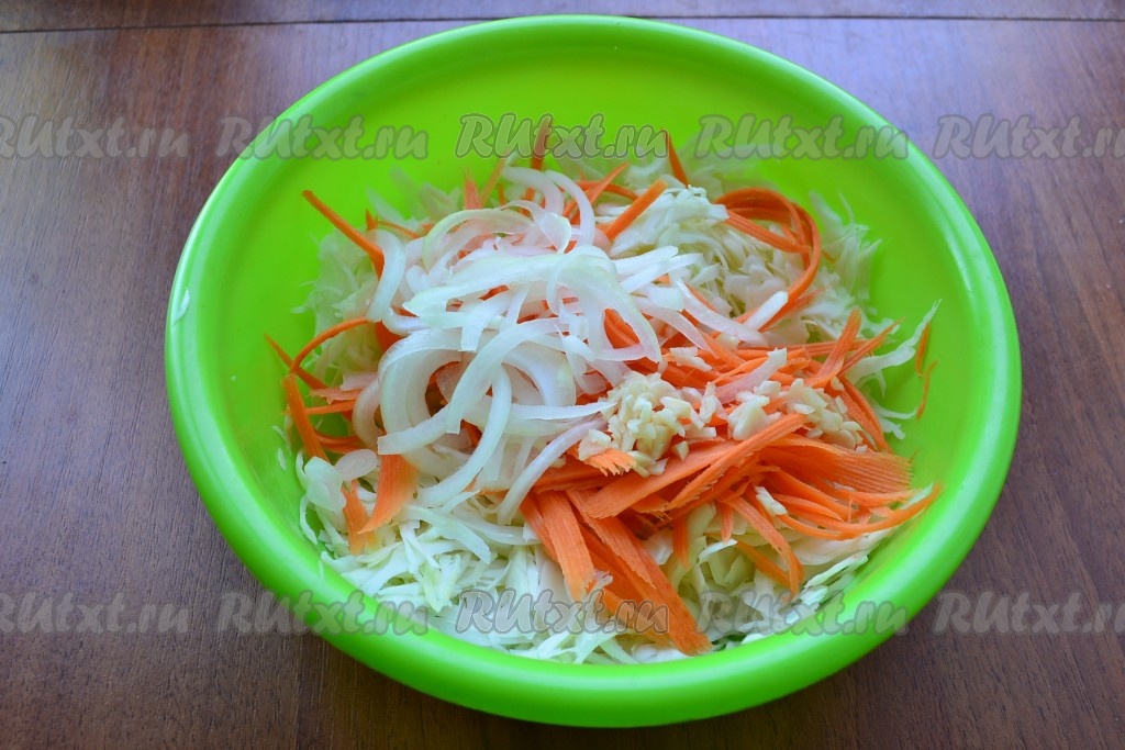 Очищенный лук, нарезанный тонкими полукольцами, и измельченный очищенный чеснок выложить к капусте с морковью и немного подавить руками.